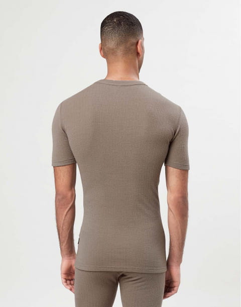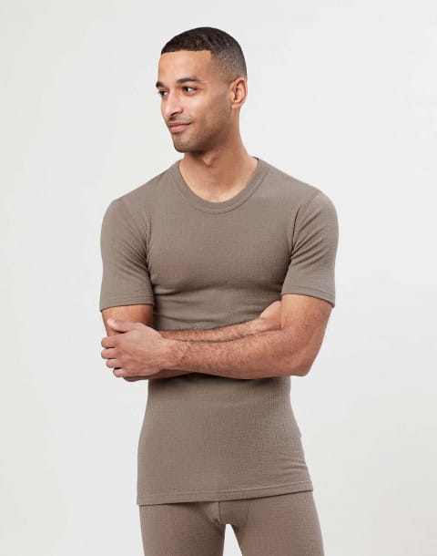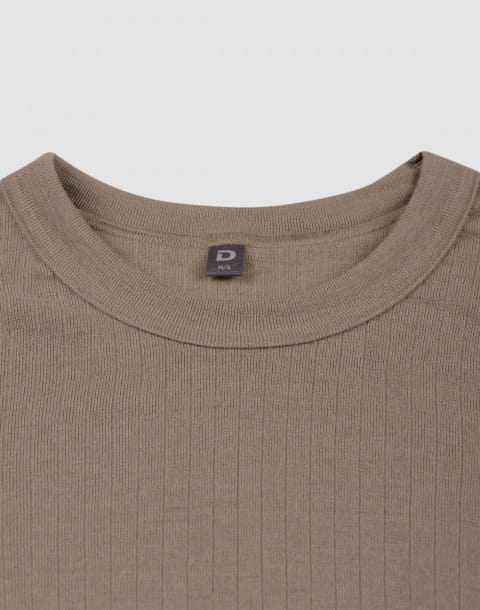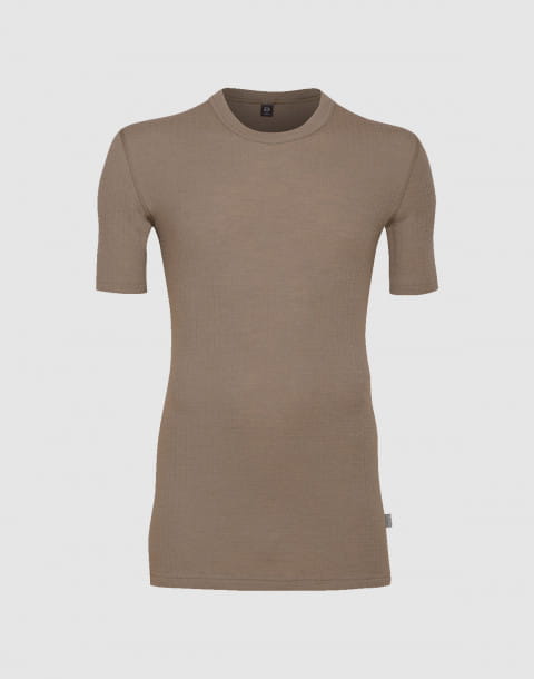 Koszulka męska z wełny merynosów (100%) - krótkie rękawy, dopasowujący splot - ciemnobeżowa - prod. DILLING
