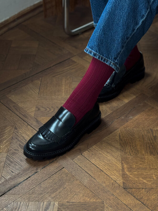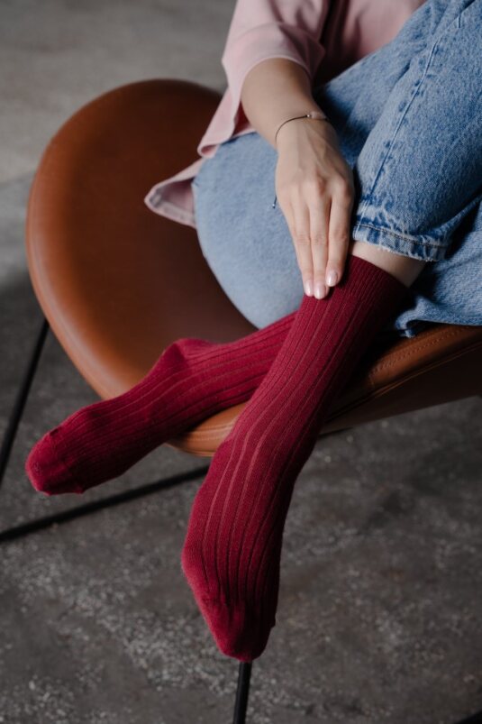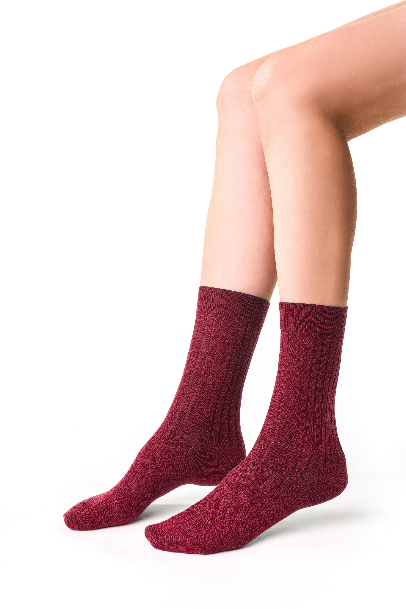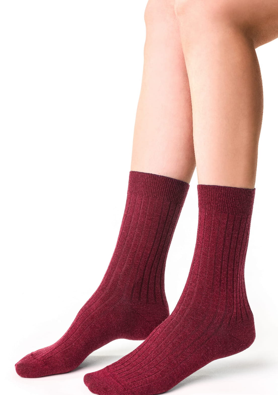 Skarpety damskie z cienkiej wełny merynosów (79%) - delikatny prążek - bezuciskowe - bordowe - Steven